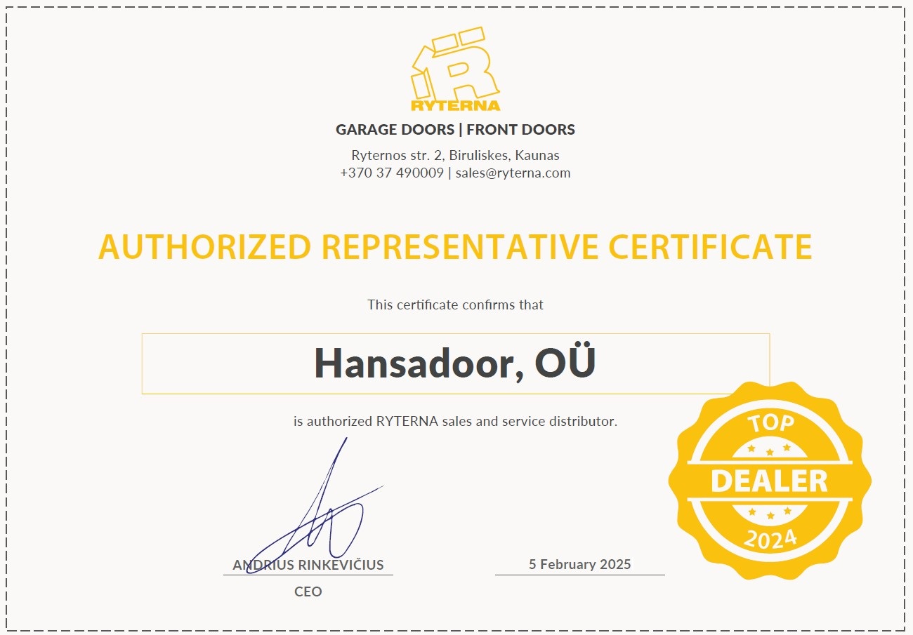 Hansadoor OÜ on uste ja väravate alal tegutsenud üle 25 aasta. Oleme ametlikud esindajad suurimatele tootjatele nagu Ryterna, BFT, Somfy ja Motorline. Pikaajalised kogemused võimaldavad pakkuda efektseid lahendusi ja teostada nii suuri, kui väikeseid projekte. Ettevõtte pikk ajalugu ja head majandusnäitajad annavad kliendile kindlustunde nii garantii, kui ka tulevikus hoolduse jätkusuutlikkuse ja varuosade osas.